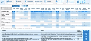 This interactive map organises more than 100 studies on Graduation programmes, their component parts, and some lump-sum cash transfer programmes, from Asia, Africa, and the Americas, making it easy to discover what works, where, and for whom. The evidence map presents a clear matrix of programme components (e.g., asset transfers, cash grants, training, and coaching) and the outcomes they affect (e.g., income, food security, health, education, and more). For further details on how the map has been developed and its contents, including definitions of interventions/components studied and outcomes, please see the brief narrative report.